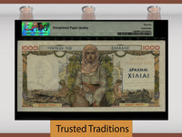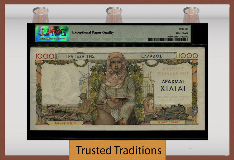 1935 1000 Drachmai from Greece. Bank of Greece. Pk 106a and serial number AI=017 168473. Graded 67 EPQ (Exceptional Paper Quality) Superb Gem Uncirculated by PMG. This beautiful note was printed in France prior to World War II utilizing all of the hallmark French security methods including a watermark, multi-color precise registration printing, and face to back registration of design elements. 1.5.1935. Multicolor. Girl in national costume at center. Back: Workman at left and right, girl in national costume at center. Printed in France.
