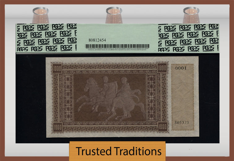 ND (1941) 1000 Drachmai from Greece / Ionian Islands. Pk M17a and serial number 0001 865373. Graded 65 PPQ (Premium Paper Quality) Gem New by PCGS with none graded finer according to PMG Population Report. This marvelous note was well preserved over the years. Crisp original paper, bold embossing and strong colors are visible though the plastic holder.