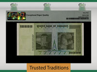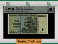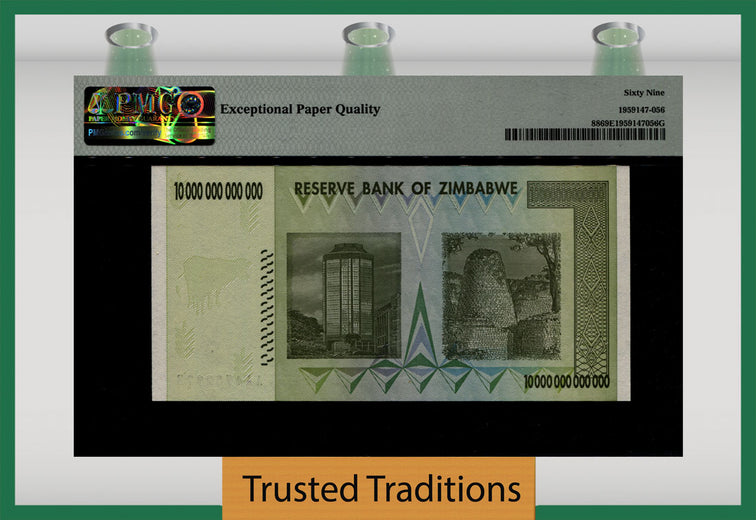 2008 10 Trillion Dollars from Zimbabwe, Reserve Bank. 2008 10 Trillion Dollars. Pick number 88 and serial number AA4752978. Graded 69 EPQ (Exceptional Paper Quality) Superb Gem Uncirculated by PMG. Beautiful banknote with impeccable margins, perfect centering, amazing bold colors, great embossing, and serial number located in the front of the note in black and red twice! Bid now and own this beautiful banknote that is seen on white crisp papwer through a PMG Holder! 2008. Green on light green underprint. Chiremba balanced rock formation. Back: modern building tower, ancient fortification.