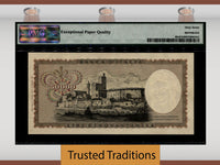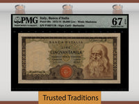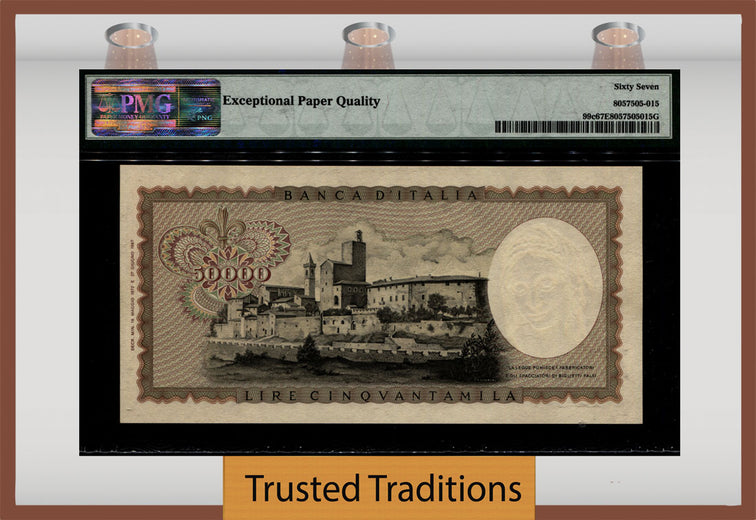 1972-74 50,000 Lire from Italy, Banca d'Italia. Pick number 99c and serial number P180711B. Graded 67 EPQ (Exceptional Paper Quality) Superb Gem Uncirculated by PMG. In the years we have been selling World Paper Money there are notes so desirable seemingly we get a call every week asking do we have a Leo note featuring Madonna in high grade. Sadly the answer is always “not today”. Today yes we do. The Italian culture was never paper money collectors and in 1967-1974 when these notes were printed in honor of the famed artist 50,000 Lire was a lot of money. It still is a lot of money today. Few survived. Once the world market realized the increasing numismatic value in high grade, the note was immediately bought up in XF and AU by the note doctors and they began washing, pressing, and bleaching as many Leo notes as they could find to fool the public. Subsequently, very few are unadulterated and remain in original condition. We urge you to take advantage of the rare opportunity to own a Leo in high grade! 16.5.1972; 4.2.1974. Brownish black, dark brown, and reddish brown with black text on multicolored underprint. Leonardo de Vinci at right. City view at center on back. Watermark: bust of Madonna. Seal with facing head of Medusa. Signature(s): Carli and Barbarito.